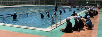 1年生が、プール開きをしました。青空の下、子どもたちの歓声が響きました。