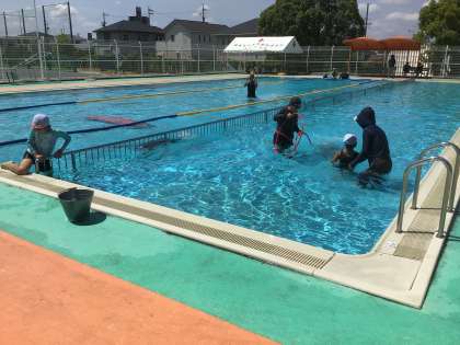 フラフープをくぐったり、大きなビート板に乗ったりして、楽しく泳ぎました。