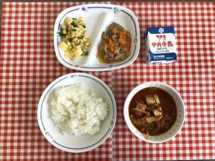 今日の給食は、『ごはん、キムチ入りみそ汁、大豆とじゃがいものサラダ、とよたひまわりポークのしょうが炒め、牛乳』です。