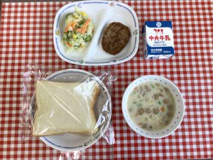 今日の給食は、『スライスパン、豆3のスープ、アーモンドサラダ、ハンバーグ、牛乳』です。