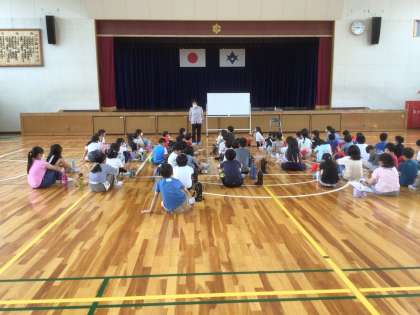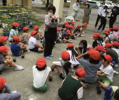 大豆名人から、大豆から作られる食品や種のまき方などを教わりました。その後、大豆名人と一緒に、大豆の種を苗ポットにまきました。これからの成長が楽しみです。