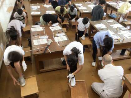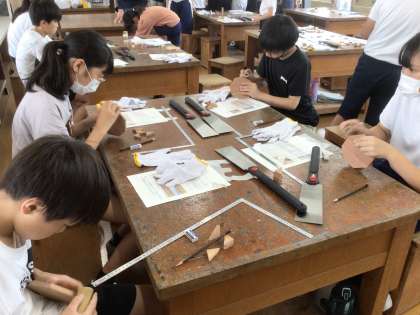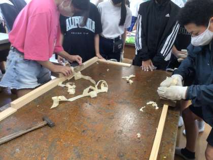 宮大工の方々を講師としてお招きし、大工道具を使って木製のコースターを作りました。その後、かんなで木を削ったり、墨壺を使って線をつけたりする体験もしました。これらの活動を通して、古くから受け継がれている道具や職人の技のすごさを体感することができました。