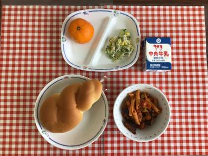今日の給食は、『ごはん、なすとペンネのトマト煮、ツナサラダ、冷凍みかん、牛乳』です。