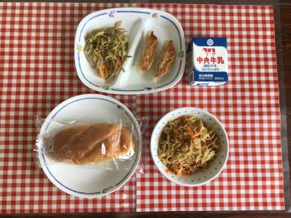 今日の給食は、『米粉パン、炒めビーフン、ごぼうサラダ、ぎょうざ、牛乳』です。