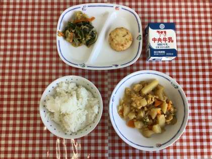 今日の給食は、『ごはん、親子煮、おひたし、豆腐しんじょ、牛乳』です。