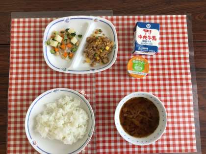 今日の給食は、『ごはん、みそ汁(備蓄用)、じゃがいもと大豆のサラダ、ツナそぼろ丼の具、野菜ゼリー、牛乳』です。
