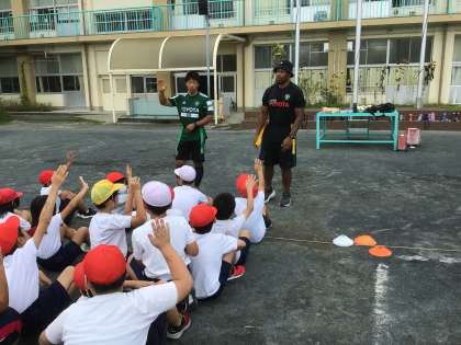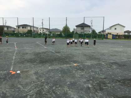 トヨタヴェルブリッツの選手をお招きし、タグラグビーのルールを教わりながら試合をしました。トライができたら、チームのみんなで喜び合いました。