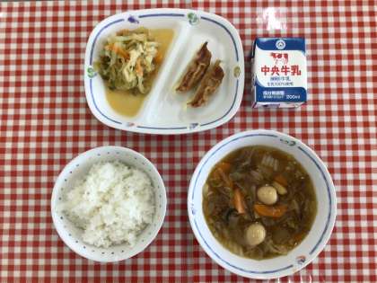 今日の給食は、『ごはん、八宝菜、バンサンスー、ぎょうざ、牛乳』です。