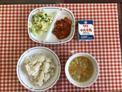 今日の給食は、『麦ごはん、パスタスープ、チーズサラダ、チキンライスの具、牛乳』です。