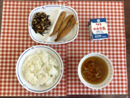 今日の給食は、『ごはん、とうがん汁、ひじきの炒め煮、ししゃもフライ、牛乳』です。