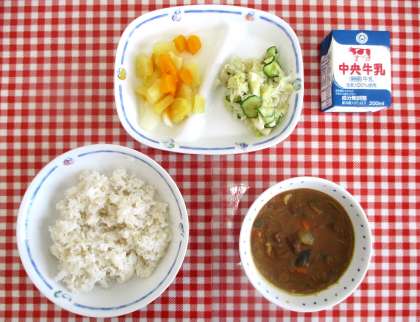 今日の給食は、『麦ごはん、夏野菜のカレーライス、いかサラダ、なしポンチ、牛乳』です。
