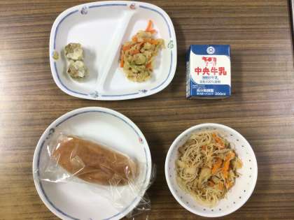 今日の給食は、『米粉パン、炒めビーフン、中華あえ、野菜入りしゅうまい、牛乳』です。
