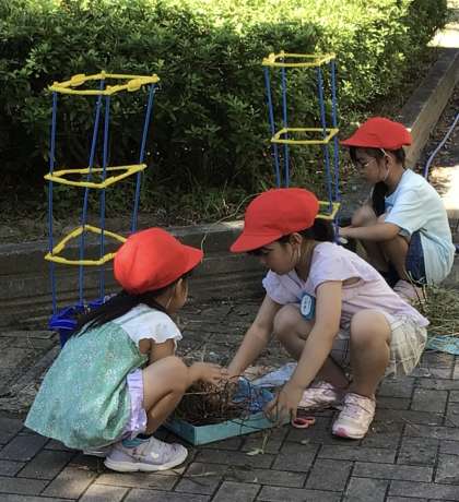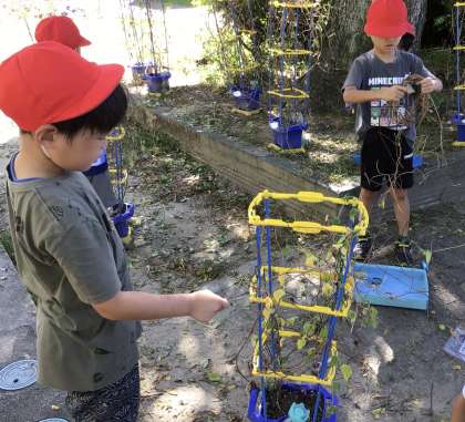 1年生がアサガオのつるを外していました。なかなか取れないとき、友達と協力する姿が素敵でした。