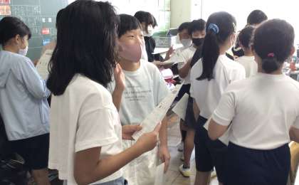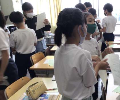 5年生が、外国語科の授業で、友達と楽しそうにやりとりをしていました。