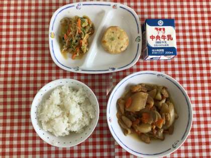 今日の給食は、『ごはん、根菜の煮物、アーモンドあえ、豆腐しんじょ、牛乳』です。