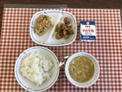 今日の給食は、『ごはん、かきたま汁、野菜のねりごまあえ、とり肉の香味ソースかけ、牛乳』です。