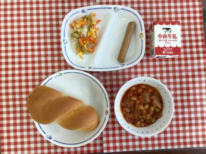 今日の給食は、『ツイストパン、ポークビーンズ、サワーキャベツ、ウインナー、牛乳』です。