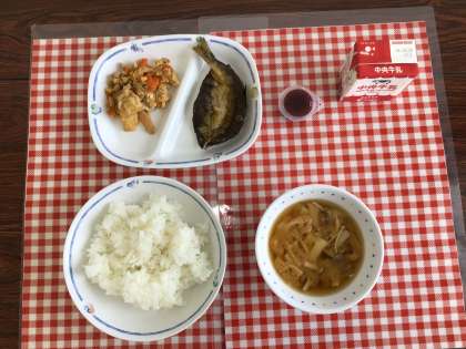 今日の給食は、『ごはん、きのこのみそ汁、とよたチャンプルー、あゆの一夜干し揚げ、ブルーベリーゼリー、牛乳』です。