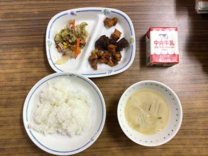 今日の給食は、『ごはん、豆乳バランスみそ汁、りっちゃんの元気サラダ、レバーとさつまいもの甘辛煮、牛乳』です。