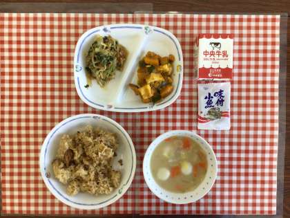今日の給食は、『三河赤鶏五目ごはん、米粉だんご汁、ほうれん草のおかかあえ、生揚げとかぼちゃのそぼろ煮、牛乳』です。