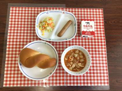 今日の給食は、『ツイストパン、ミネストローネ、コーンコールスローサラダ、ウインナー、牛乳』です。