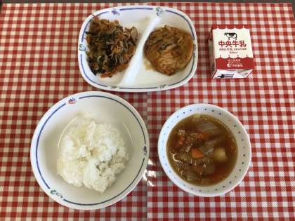 今日の給食は、『ごはん、はるさめスープ、ビビンバ丼の具、チヂミ、牛乳』です。