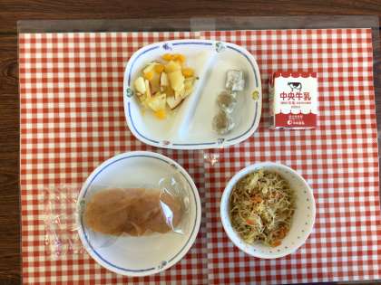 今日の給食は、『米粉パン、炒めビーフン、りんごポンチ、しゅうまい、牛乳』です。