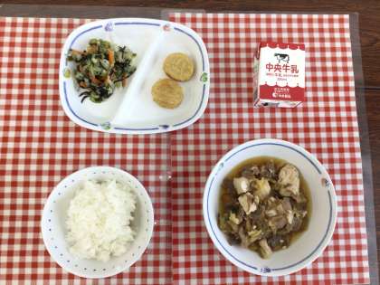 今日の給食は、『ごはん、すき焼き風煮、海藻サラダ、たらナゲット、牛乳』です。