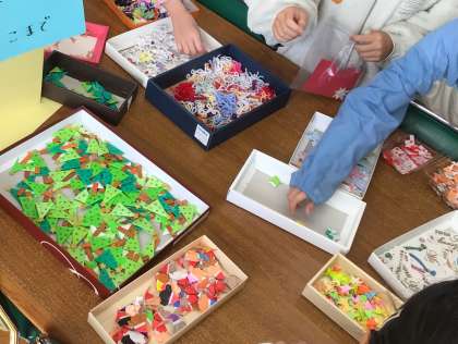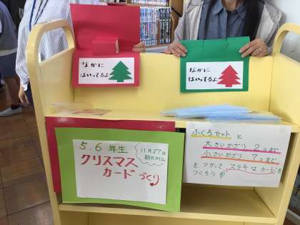 図書ボランティアの方が、あらかじめ折り紙で飾りを作成してくださっていました。朝日タイムに子どもたちがカードに飾り付けをしました。素敵な素敵なカードができました。