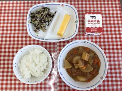 今日の給食は、『ごはん、だいこんのそぼろ煮、ひじきサラダ、厚焼き卵、牛乳』です。