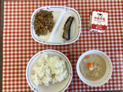 今日の給食は、『ごはん、豆乳のバランスみそ汁、根菜のきんぴら、いわしのしょうが煮、牛乳』です。