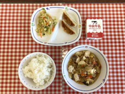 今日の給食は、『ごはん、豆腐の中華煮、バンサンスー、ぎょうざ、牛乳』です。
