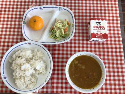 今日の給食は、『麦ごはん、カレーライス、チキンサラダ、みかん、牛乳』です。