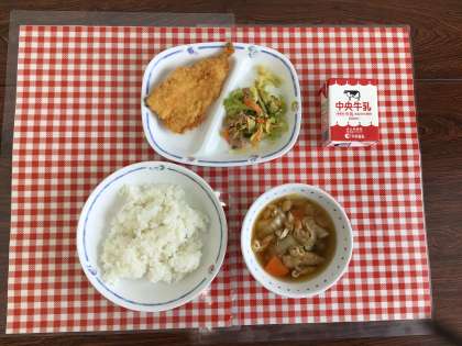 今日の給食は、『ごはん、かしわ汁、和風サラダ、にぎすフライ、牛乳』です。