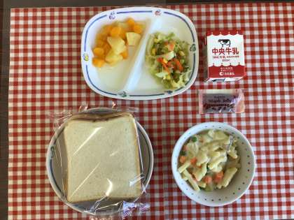 今日の給食は、『スライスパン、マカロニのクリーム煮、フレンチサラダ、ミックスフルーツ、メープルジャム、牛乳』です。