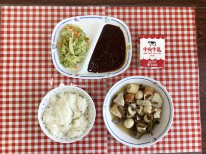 今日の給食は、『ごはん、おでん、青菜あえ、肉みそ、牛乳』です。