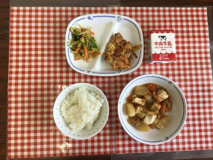 今日の給食は、『ごはん、だいこんのそぼろ煮、アーモンドあえ、わんぱくじゃこ天、牛乳』です。