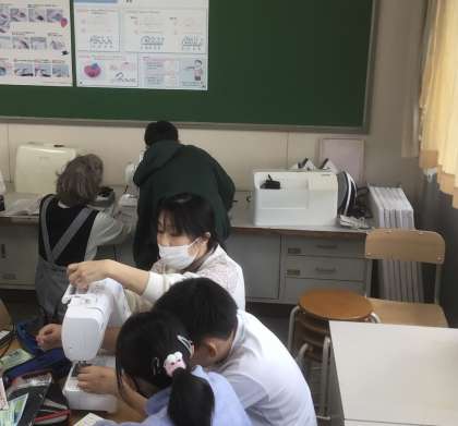 「ミシンにトライ!」の学習で、直線を縫う練習をしました。ミシンボランティアの方々のおかげで、スムーズに縫うことができました。