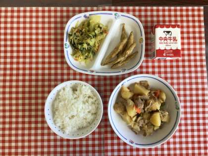 今日の給食は、『ごはん、肉じゃが、いり大豆あえ、わかさぎのから揚げ、牛乳』です。