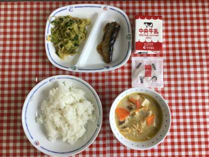 今日の給食は、『ごはん、粕汁、ほうれんそうのおひたし、いわしの梅煮、牛乳』です。