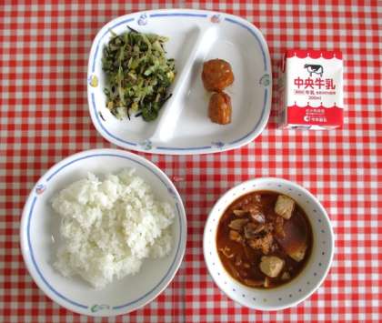 今日の給食は、『ごはん、キムチ入りみそ汁、ひじきサラダ、愛知のれんこん入りつくね、牛乳』です。