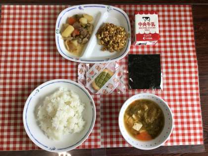 今日の給食は、『ごはん、あおさ汁、肉じゃが、納豆まき、手巻きのり、ひまわり型クッキー、牛乳』です。