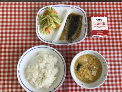 今日の給食は、『ごはん、かきたま汁、和風サラダ、いわしのかば焼き、牛乳』です。