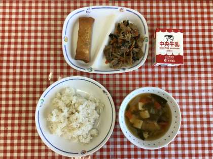 今日の給食は、『麦ごはん、五目スープ、ビビンバ丼、春巻き、牛乳』です。