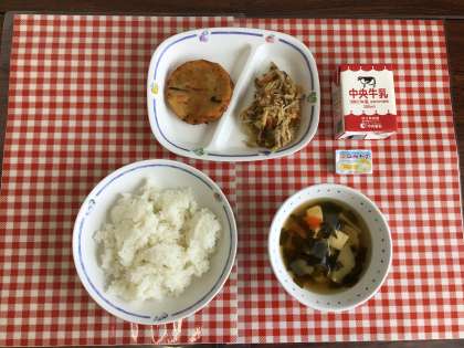 今日の給食は、『ごはん、わかめスープ、切干しだいこんのチャプチェ、チヂミ、牛乳』です。