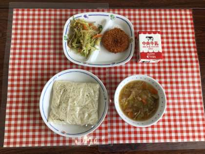 今日の給食は、『ソフトめん、野菜あんかけ、ごぼうサラダ、いかカツ、牛乳』です。