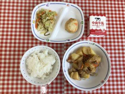 今日の給食は、『ごはん、肉じゃが、キャベツの昆布あえ、豆腐しんじょ、牛乳』です。