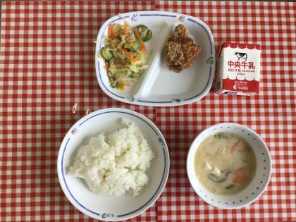 今日の給食は、『ごはん、豆乳のバランスみそ汁、和風サラダ、とり肉のから揚げ、牛乳』です。