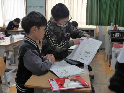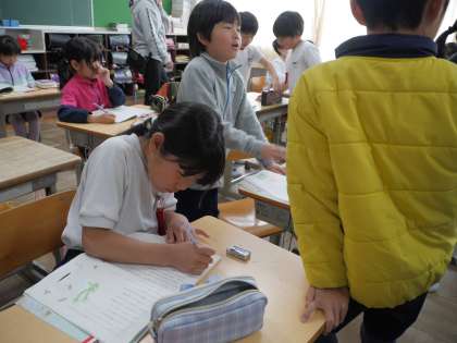 詩の音読のしかたについて真剣に話し合っています。