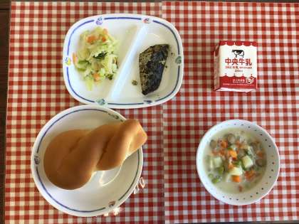 今日の給食は、『ツイストパン、豆3のスープ、コールスローサラダ、さわらのハーブ焼き、牛乳』です。